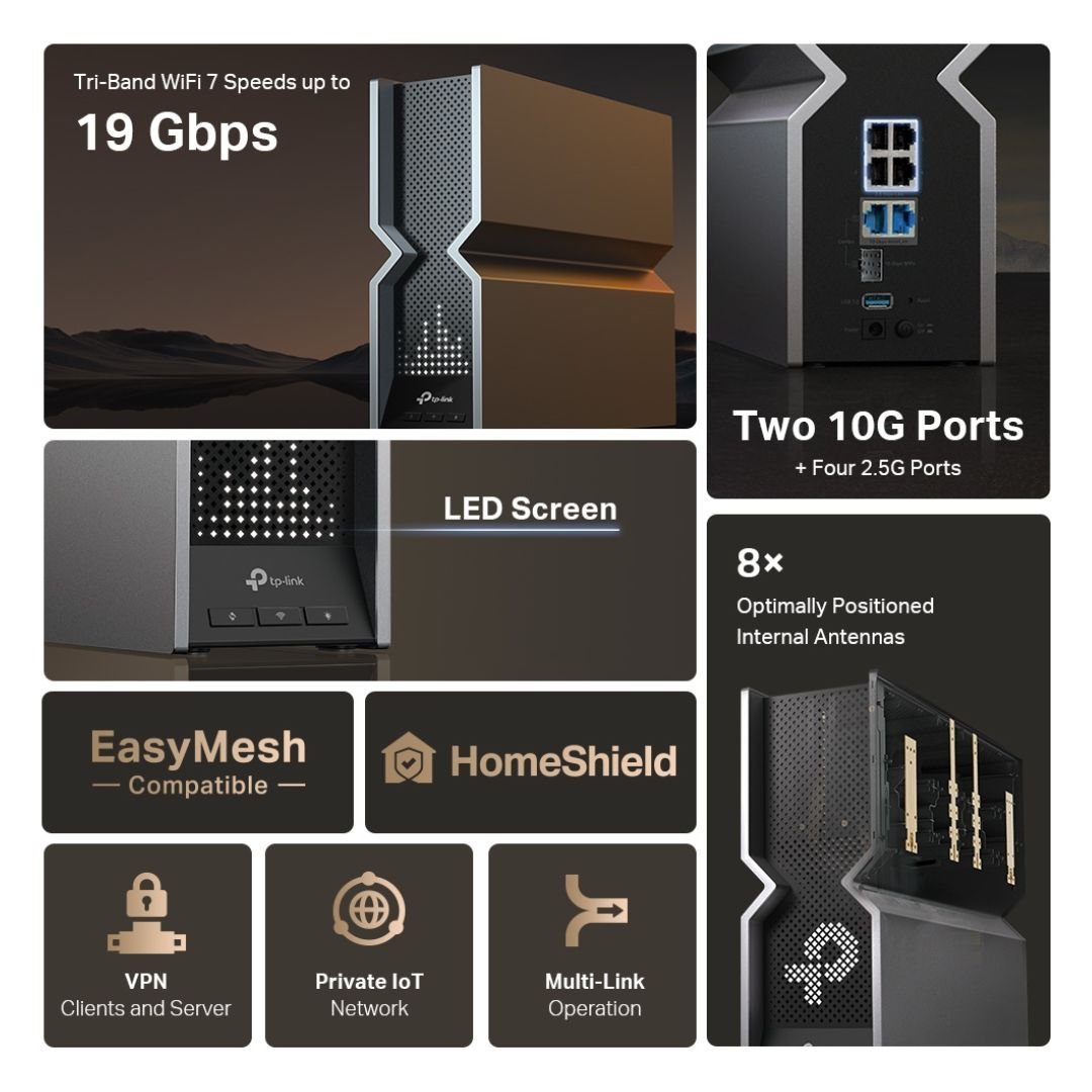 - Speed: Up to BE19000 tri-band performance with 2.4 GHz, 5 GHz, and 6 GHz bands.
